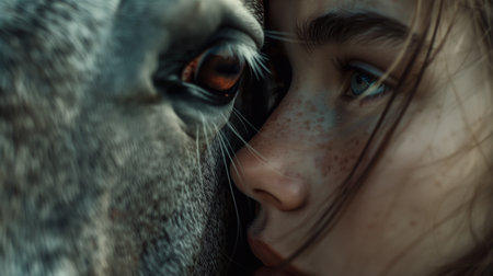 A young girl found peace and relief from stress in connection with an animal. Love and devotion between people and animals. Woman looking into the eyes of a horse