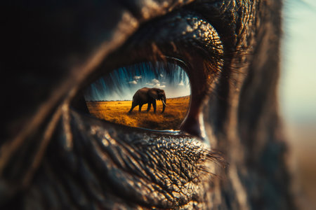 Close up of an elephant's eye reflecting another elephant walking in the African savanna, showcasing the beauty and wonder of nature