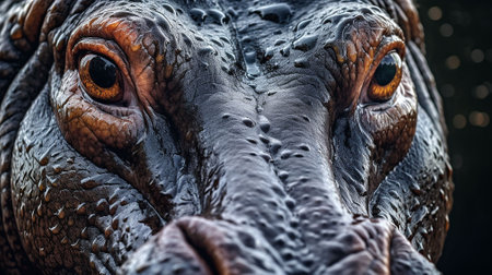 An AI generated illustration of a close-up of a mythical creature with bright orange eyes and dewdrops