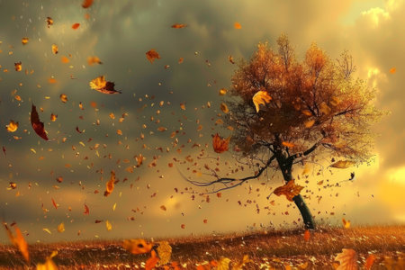 Captivating image of vibrant orange autumn leaves swirling in the wind, set against a soft blue sky, showcasing the beauty and transience of the fall season.