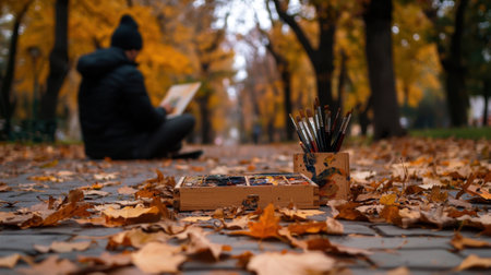 A man is sitting on the ground with a sketchbook and a box of paintbrushes. The scene is set in a park with autumn leaves on the ground. The man is in the process of creating a painting