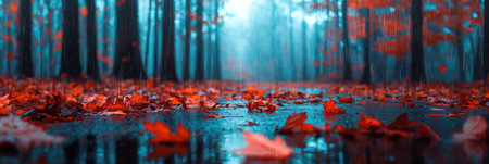 This captivating autumn scene features a serene forest path adorned with vibrant, rain-soaked leaves, creating a tranquil and mesmerizing atmosphere.