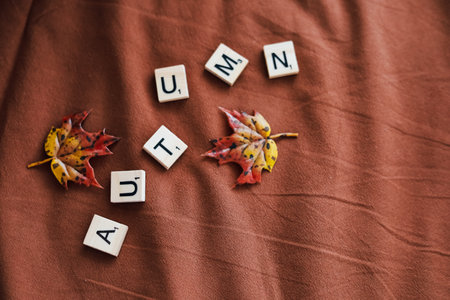 Autumn leaves in shades of red and yellow are placed next to wooden letters that spell autumn on a textured brown fabric background.