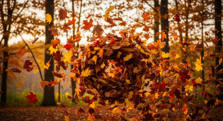 Beautiful autumn leaves falling in a serene park filled with vibrant colors during a sunny afternoon