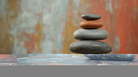 Zen Stone Stack on Textured Background. A balanced stack of smooth stones set against a textured gray background, evoking a sense of calm and mindfulness.