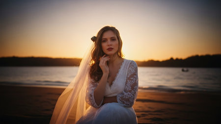 An image of a very attractive Mexican young woman, dressed in a designer wedding dress and with a veil over her face, posing in front of the camera directly with an attitude of reflection and serenity, sunset light and fill flash