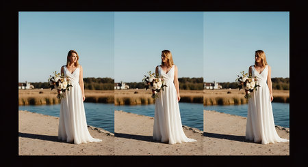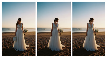 A triptych of a woman in a white wedding dress standing on a beach, holding flowers and a purse, with the ocean and sunset in the background, showcasing her elegance and serenity.