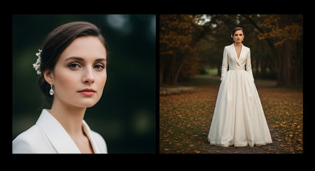 A collage of two photos featuring a woman in a white wedding dress and a close-up portrait of her, showcasing her elegant appearance and serene surroundings in an autumnal outdoor setting.