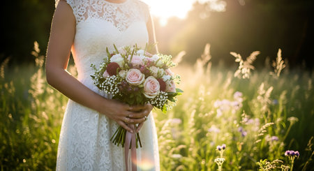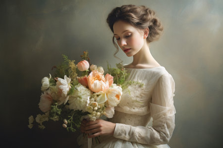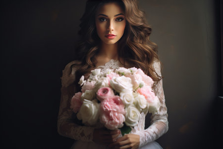 A romantic lady model in a delicate lace gown holding a bouquet of flowers, Ai generated