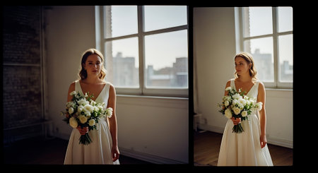 A beautiful bride in a white wedding dress holding a bouquet of flowers in a bright room with large windows.