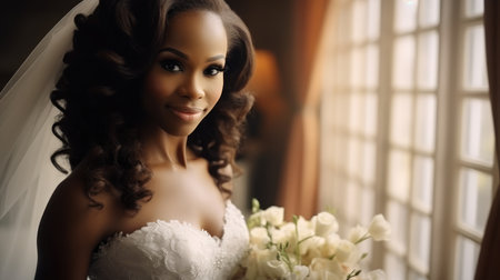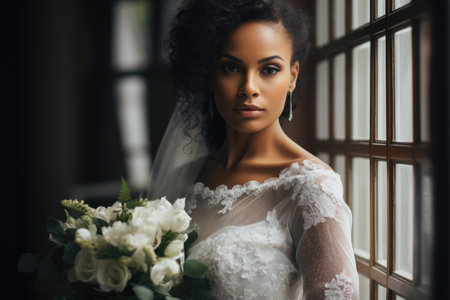 A woman in a wedding dress holding a bouquet of flowers, ready for her special day, Portrait of black people the beautiful bride against a window indoors, AI Generated