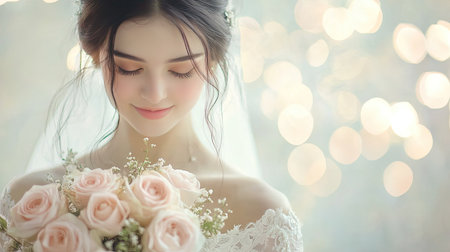 A stunning bridal portrait of a bride holding a bouquet of pale pink roses, with a soft and dreamy bokeh effect.