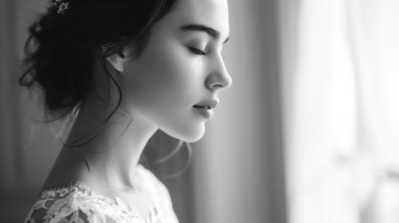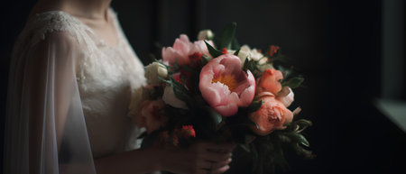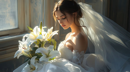 A serene bride in a soft-lit setting, holding a bouquet of white lilies. This image captures the elegance and beauty of wedding moments, radiating romance and tranquility.