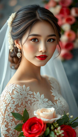 Beautiful asian woman in white wedding dress with bouquet of flowers