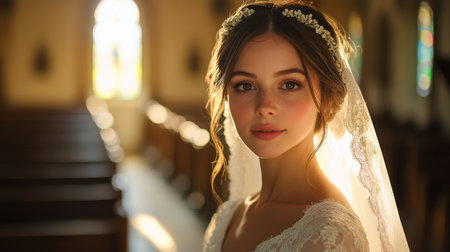 Bridal Portrait in a Sunlit Church With Stained Glass Windows Illuminating the Joyful Expression of a Bride Generative AI