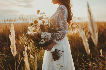 Beautiful bride in wedding dress with bouquet posing in field at sunset