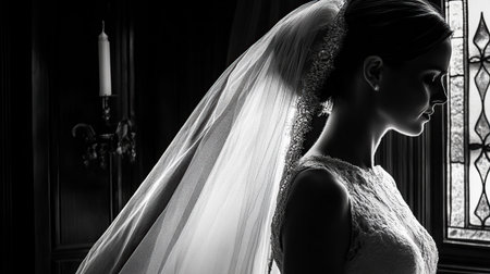 A beautiful bride stands in a dimly lit room, gazing out through a stained-glass window, adorned in a flowing wedding veil and lace gown.