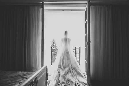 Back view of beautiful young woman in white wedding dress looking out the window