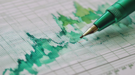 Green pen on financial chart showing data trends and analysis, representing investment growth and market fluctuations, ideal for business and finance themes