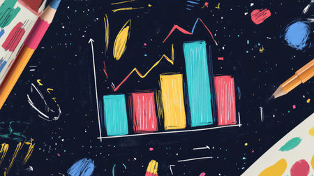 A vibrant and creative illustration of hand-drawn graphs and arrows on a notebook, showcasing financial analysis and business growth concepts in a warm workspace.