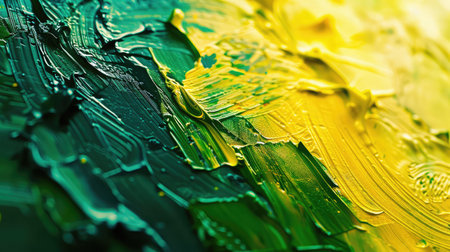 Abstract art background. Oil painting on canvas. Green and yellow texture. Fragment of artwork. Spots of oil paint. Brushstrokes of paint. Modern art. Contemporary art.