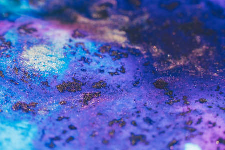 Mixed paints art. Abstract design background. Purple blue glitter ink blend