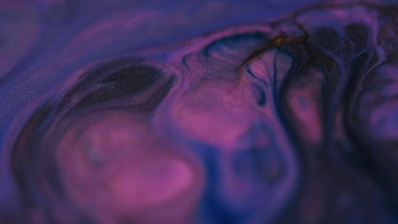 Fluid art. Sparkling ink flow. Blur purple pink black color shiny glitter grain particles acrylic paint mix emulsion liquid pigment leak abstract background.