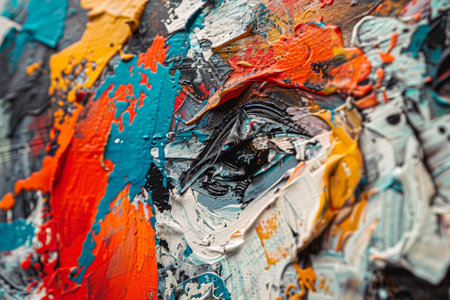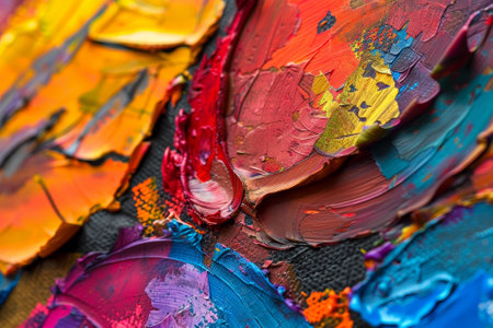 Close-up view of colorful paint strokes on canvas, showcasing vibrant hues and rich textures. This abstract composition captures creativity and artistic expression.