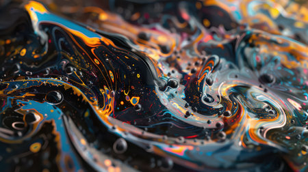 Thick liquid paint mixing, forming dynamic flowing patterns and intricate splashes with diverse colors