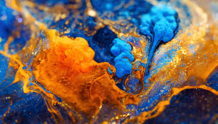 A breathtaking depiction of blue and orange liquid ink mixing in a realistic and intricately pattern, capturing fluid movement, rich texture, and vibrant colors to evoke creativity and visual