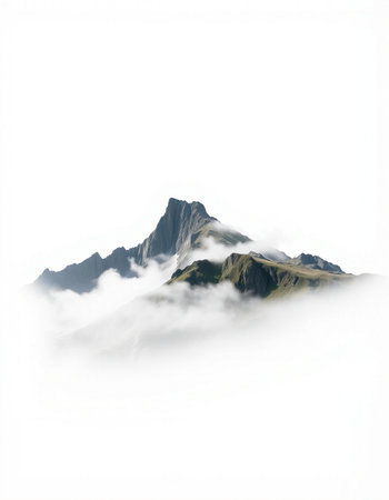 Mountain peak in the clouds, isolated on a white background.
