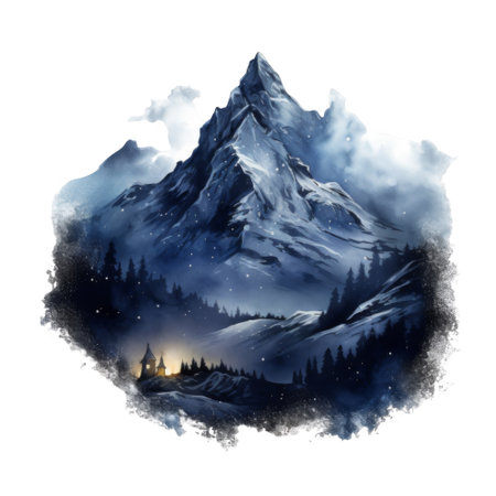 Snowy mountain isolated on white background. Snow covered mountain peak.