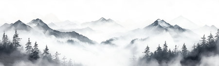 Mountain range landscape with forest and fog on white background with copyspace