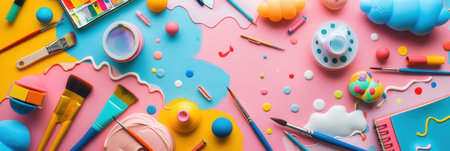 Various art supplies including brushes, paints, and sketchbooks are arranged on a bright, playful surface, ready for creative activities.
