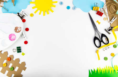 The background is a view from above on a white table with children's creativity. On the table of colored paper the sun, clouds, grass, fence, palette, scissors, colored buttons
