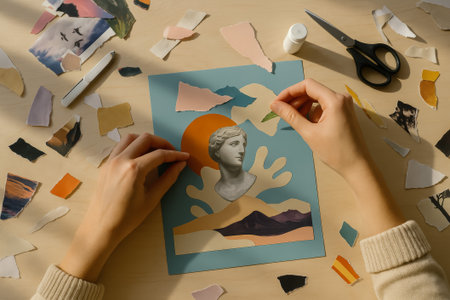 Hands arranging paper cutouts to create an artistic collage on a blue background