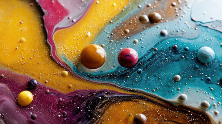 Experience the mesmerizing beauty of abstract liquid art featuring colorful swirls and glossy spheres. This captivating piece highlights the dynamic interplay of colors and textures, perfect for artistic expression or creative projects.