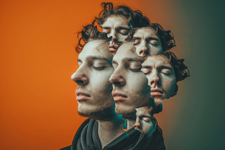 Conceptual portrait with man surrounded by his multiple personalities. Depressed person with multiple personality disorder