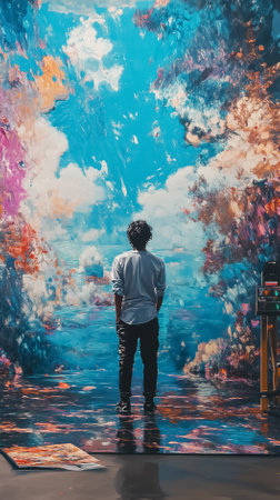 Artist gazing at large abstract painting in studio. Vivid colors and dramatic textures create immersive atmosphere. Concept of creativity, artistic expression, art studios.