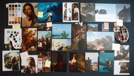 Famous painting reproductions with sticky notes, color palette and brushes, museum postcards scattered.