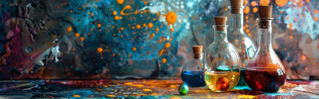 Artistic arrangement of colorful glass bottles filled with various liquids, set against a splattered paint background, creating an eclectic and vibrant scene.