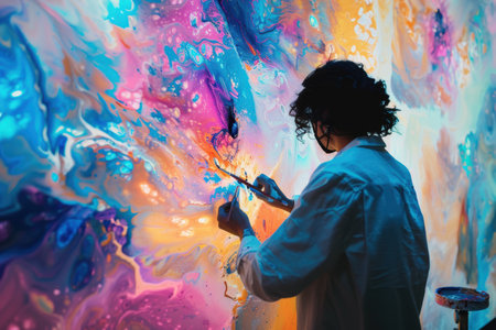 A close-up view of a hand using a brush to create swirling colors on canvas. This vibrant masterpiece showcases the beauty of artistic expression.