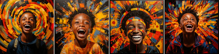 Four individuals display excitement and happiness in a colorful setting, showcasing a range of joyful expressions and poses.