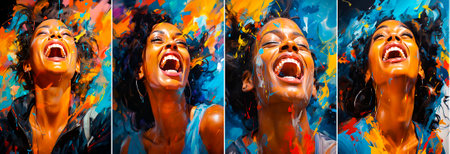 Collage of 4 photos. A bright picture of a laughing woman. A piece of art that will bring joy and energy to any space. Will add brightness and individuality to the decor of your home or office.