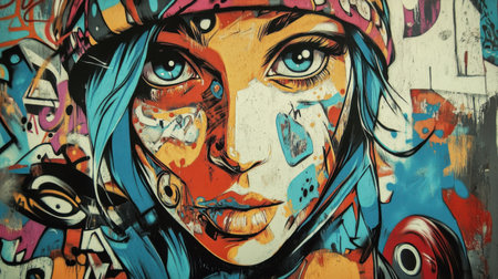 A vibrant mural showcases a woman's face with bright blue hair and expressive eyes, surrounded by colorful graffiti in an urban environment. The artwork reflects street culture and creativity.