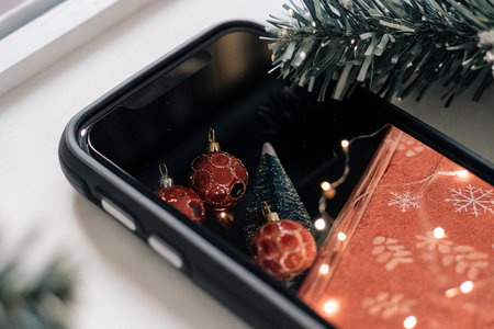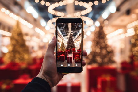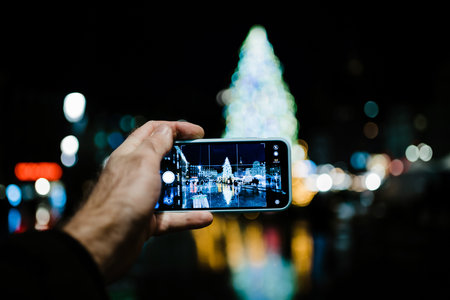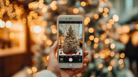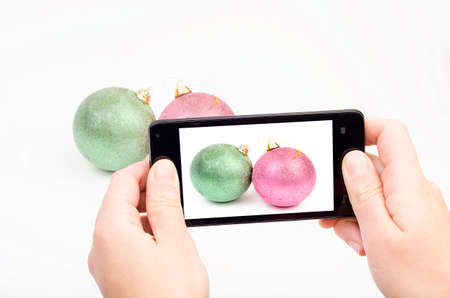 Mobile phone in hand photographing Christmas decorations