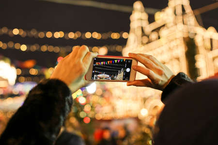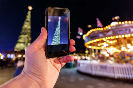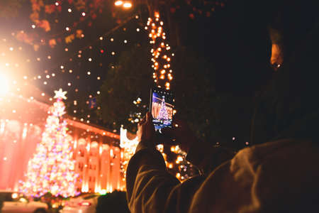Young caucasian woman hold phone and take photograph of xmas tree in city center at night, Georgia, Tbilisi