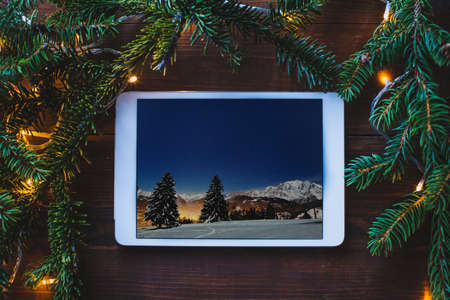 digital tablet computer on christmas background with place for text