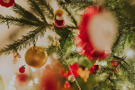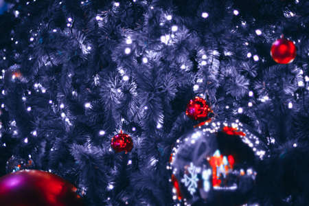Decorated Christmas tree close-up. Red balls and a garland with illumination with lanterns. New Year's baubles macro photo with bokeh. Winter holiday light decoration