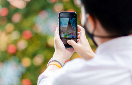 BANGKOK THAILAND, 25 NOVEMBER 2021 : Thai people taking Christmas tree photo with smartphone at Central World shopping mall while have to wear face mask before go in at event area.